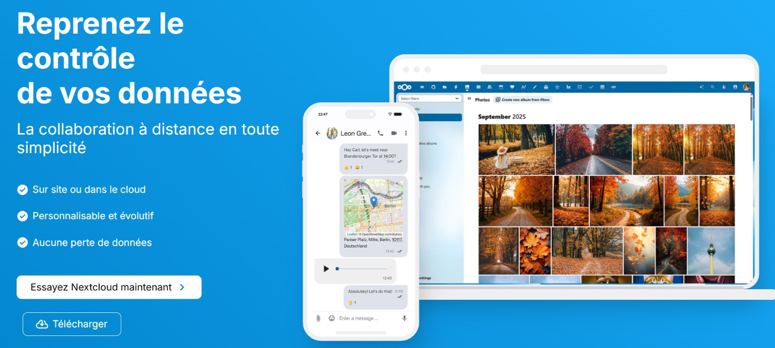 Nextcloud est aujourd’hui bien plus qu’un simple outil de stockage en ligne. C’est une véritable plateforme collaborative qui permet de stocker, synchroniser et partager des fichiers tout en offrant des services essentiels comme l’agenda, les contacts, la messagerie, la visioconférence ou encore l’édition collaborative de documents. Son principal atout réside dans sa philosophie : donner aux utilisateurs un contrôle total sur leurs données, loin des grandes plateformes cloud dont l’emplacement et la gestion restent souvent flous.