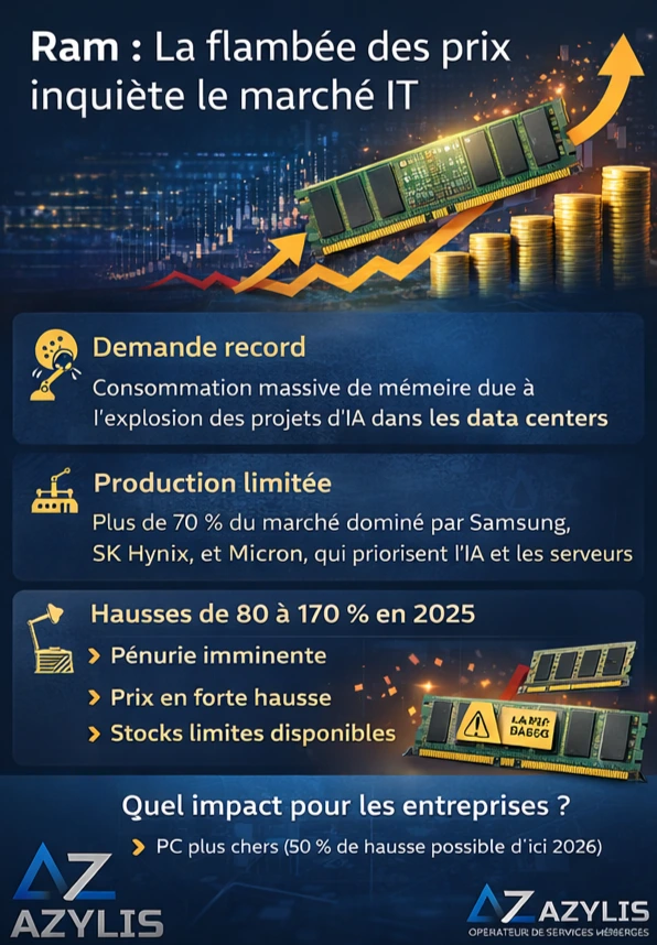 Depuis 2025, le marché des composants informatiques vit une période de turbulence sans précédent. Après les fortes hausses observées sur les cartes graphiques, ce sont désormais les barrettes de mémoire vive (RAM) qui connaissent une augmentation spectaculaire, avec des répercussions sur l’ensemble de la chaîne IT. Cette crise est loin d’être anecdotique : elle redéfinit les stratégies d’achat pour les entreprises, les intégrateurs et les utilisateurs professionnels.