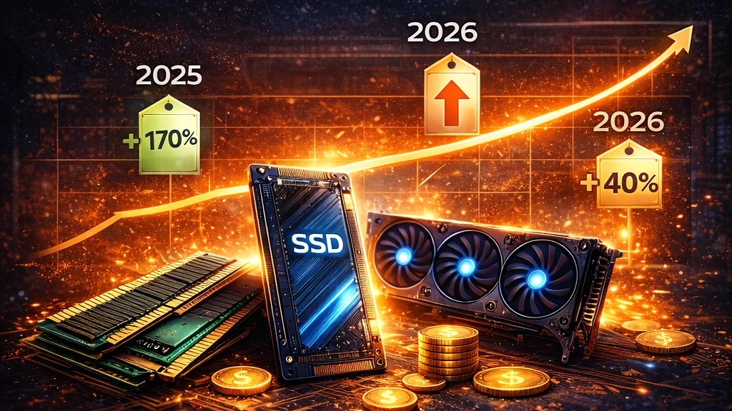 Stockage SSD (fin 2025) : inversion de tendance après des années de baisse. Les contrats NAND flash ont bondi de +50 à +75 %, sous l’effet d’une demande exponentielle en stockage pour l’IA et d’une réduction volontaire de la production. Les SSD grand public pourraient augmenter de +40 % dès le premier trimestre 2026.